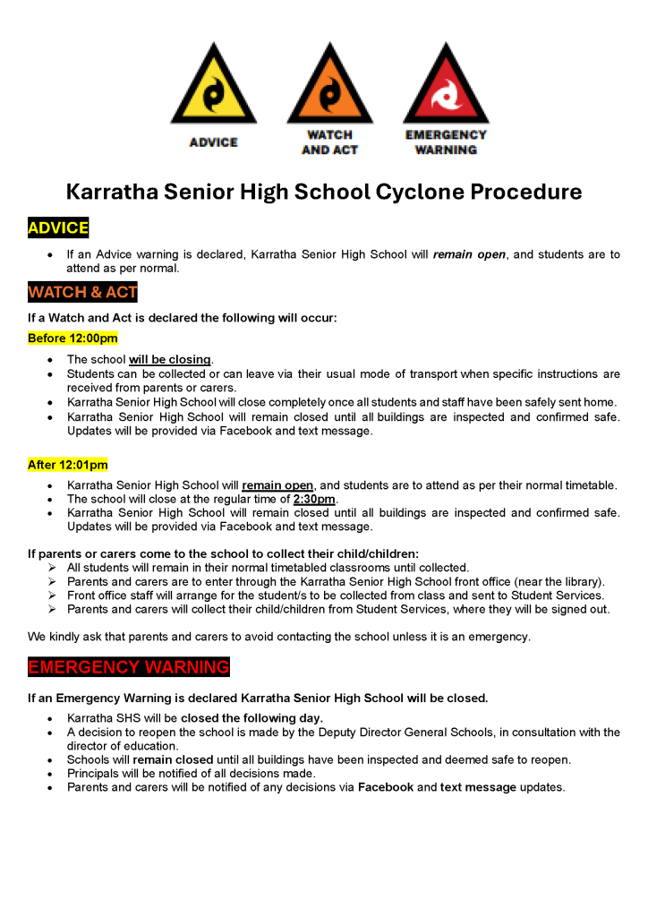 If an Emergency Warning is declared Karratha Senior High School will be closed the following day until we are advised that we can re-open.