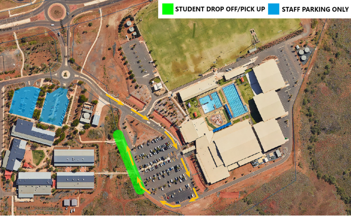 Karratha SHS has a designated area at the Leisureplex car park for student pick-ups and drop-offs. This has been designed to keep the traffic flowing and to allow students a safe access point to the school grounds. Cars parking in our bus bays causes delays for our school buses and creates an unsafe area if students are wandering through the car park before and after school. We ask that all families please follow this map below showing the pick-up and drop-off area.
